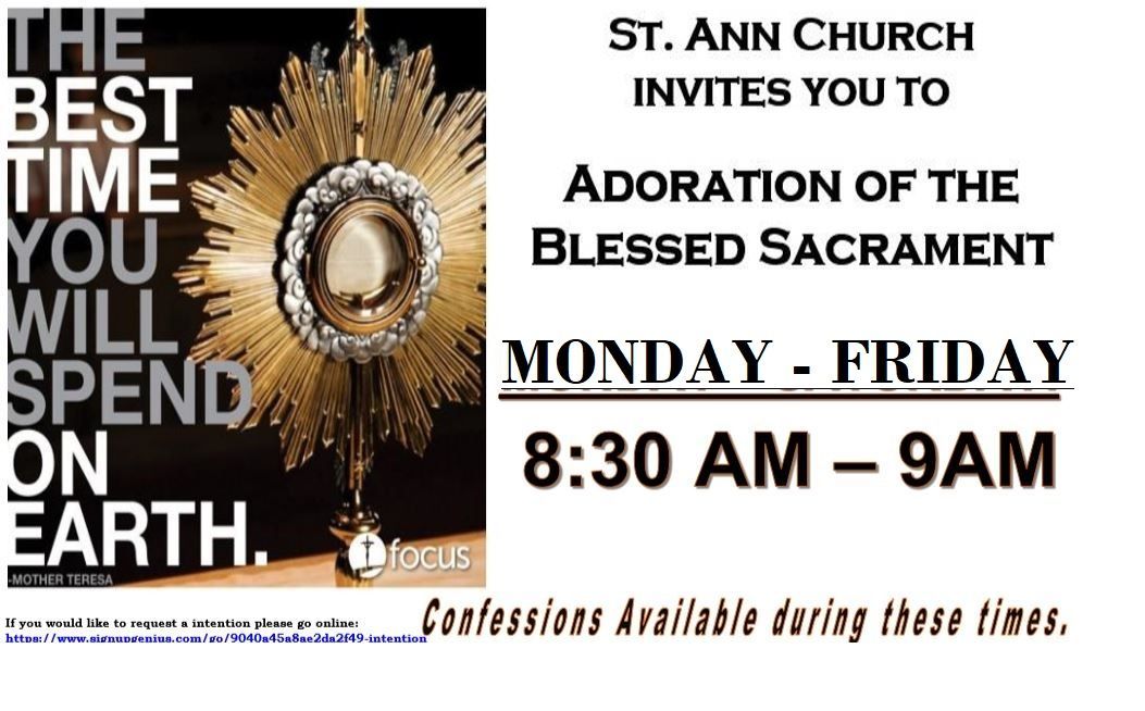 Confession: Weekdays Available only during Adoration time 8:30am - 9am