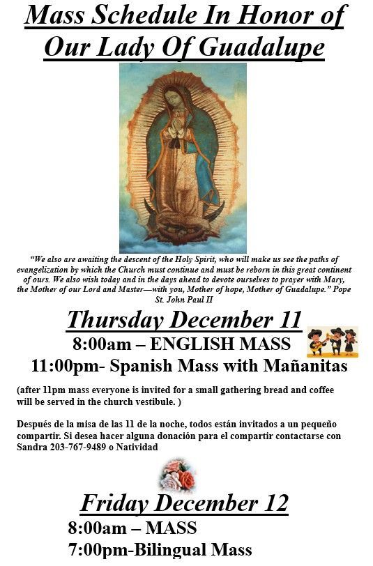 Sunday: 8:30am English | 9:45 am English | 12:00 pm Spanish Mass